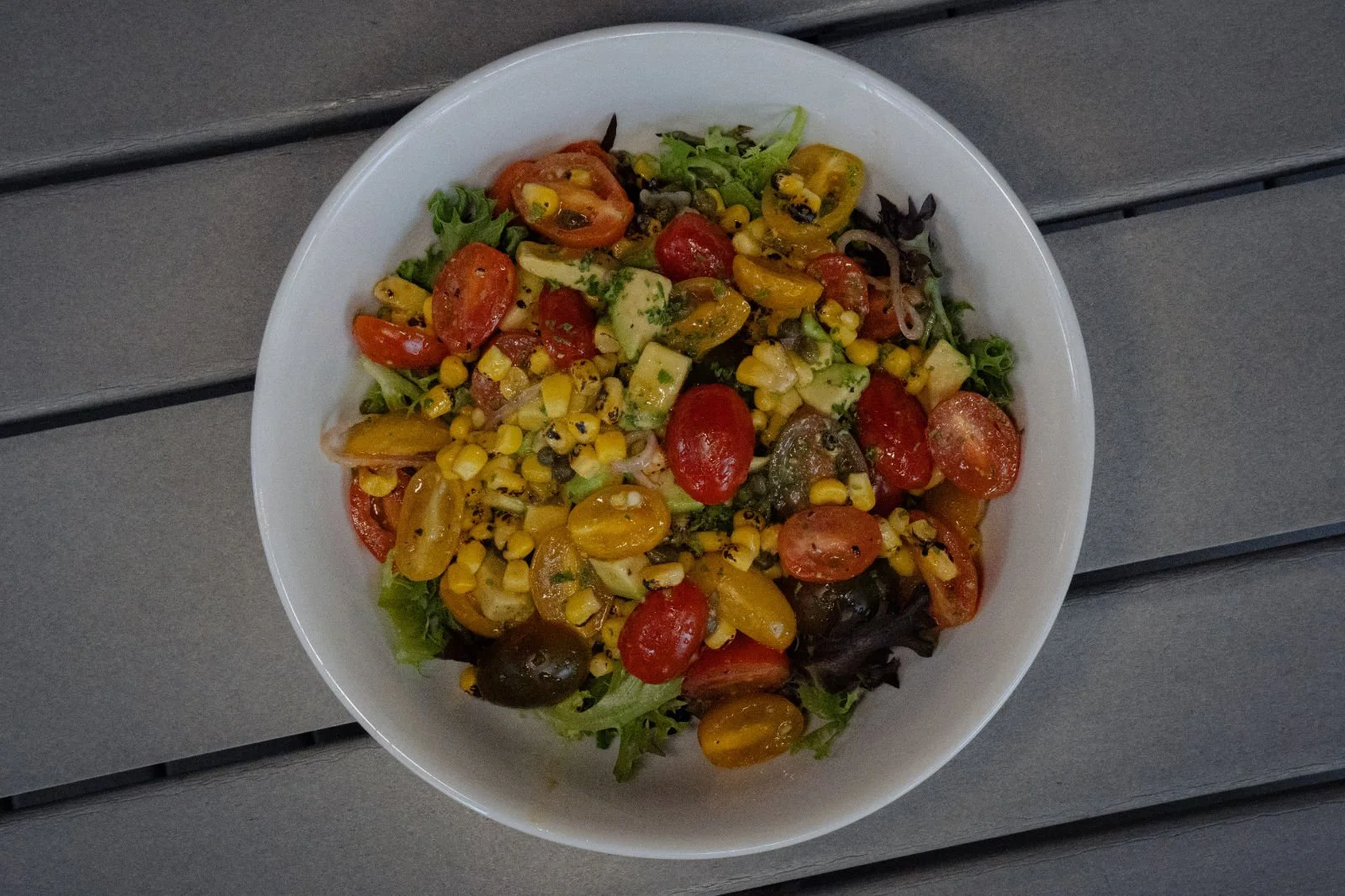 (comes dressed) mixed green | heirloom tomato | avocado | shaved shallot | caper | lemon | charred corn | black pepper vinaigrette